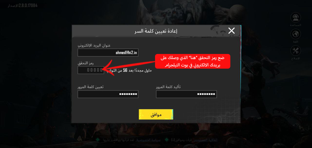 انسخ أو احقظ رمز التحقق ثم قم بالعودة إلى ببجي موبايل ثم ضع رمز التحقق في الخانة المخصصه له ثم اختر "موافق" .
