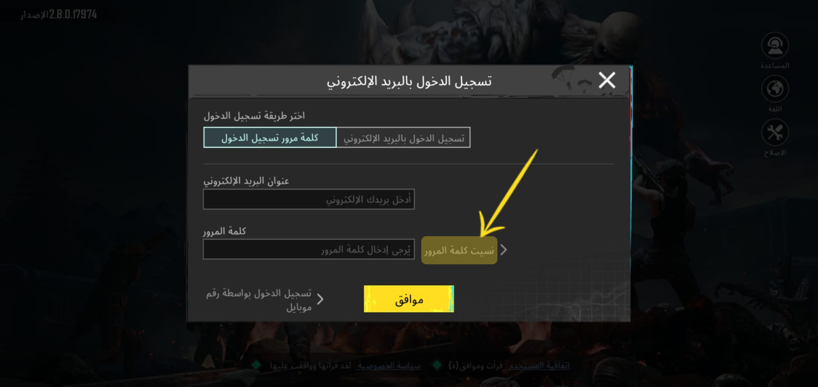 تهانينا! لقد تم تغيير كلمة السر الخاصة بحسابك في ببجي موبايل, قم بالعودة إلى البداية في صفحة تسجيل الدخول في ببجي موبايل ثم اختر تسجيل الدخول بالبريد الالكتروني, ضع بريدك الالكتروني الخاص بحساب ببجي موبايل وكلمة السر الجديدة التي أنشأتها ثم اختر "موافق" وسيتم دخولك الى حساب ببجي موبايل.