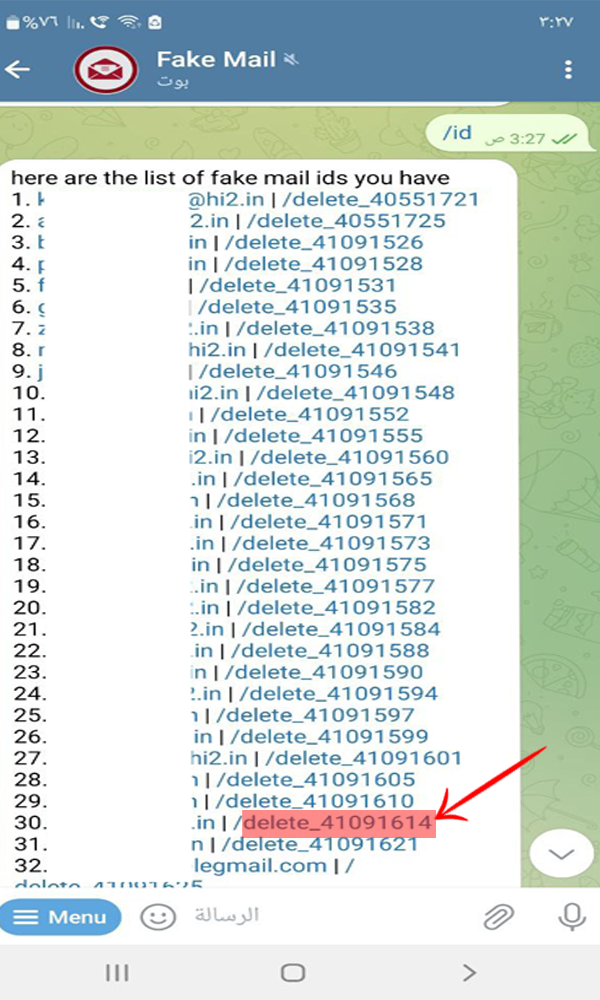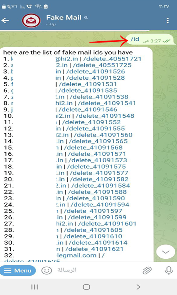 من خلال أمر /id يمكنك عرض جميع الايميلات المؤقتة التي أنشأتها.