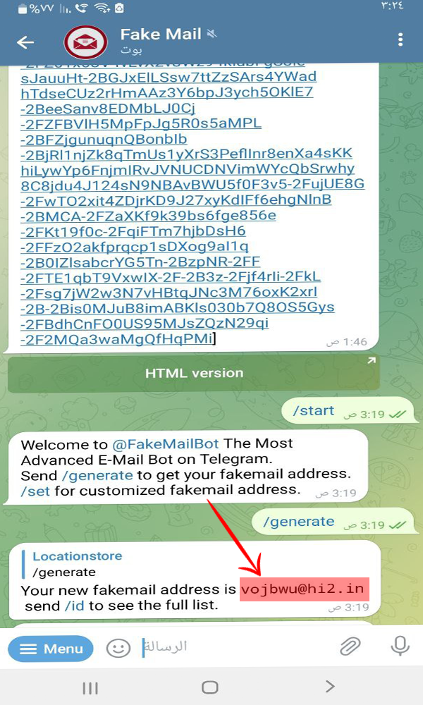 سيظهر لك ايميل تم إنشاءه عشوائياً, يمكنك استخدامه في أي موقع الآن واستقبال الرسائل الواردة عليه من خلال بوت FakeMail .