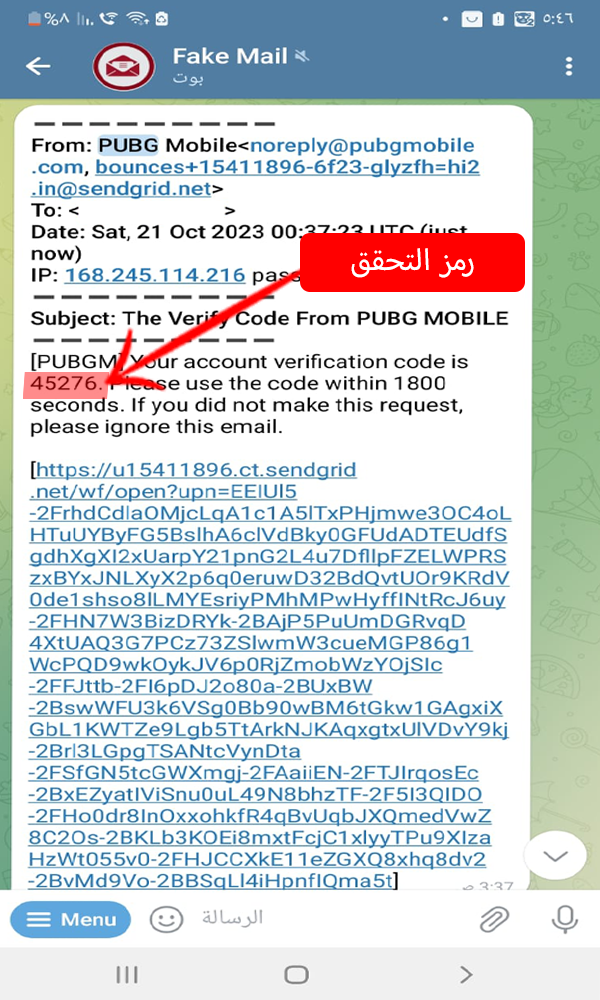 الآن قم بالذهاب إلى تطبيق تيلجرام ثم افتح محادثة بوت "FakeMail", ستجد "رمز التحقق" لتغيير كلمة السر الخاصة بالدخول بالبريد الالكتروني في ببجي موبايل,