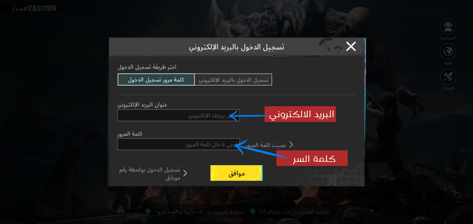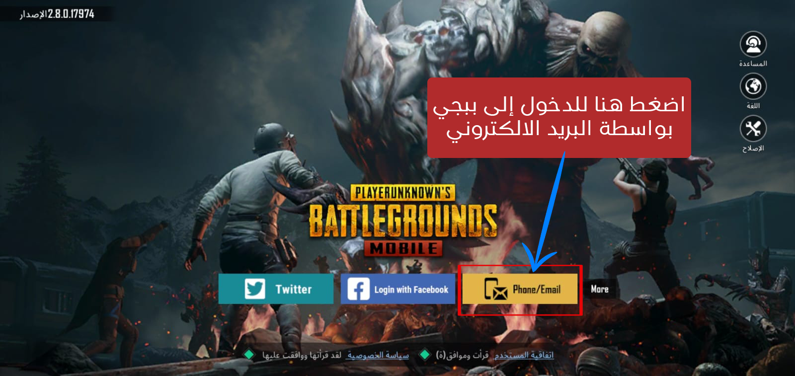 الآن إذهب إلى لعبة ببجي موبايل وقم بتسجيل الدخول لحسابك في ببجي بواسطة "البريد الالكتروني/الهاتف"